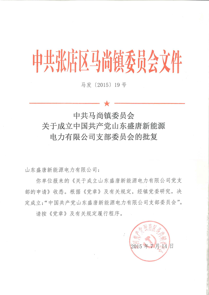 为加强基层党组织建设和党员管理,充分发挥党组织的团结作用和共产党员的先锋模范作用,经中共张店区马尚镇委员会的批准成立中共共产党山东盛唐新能源电力有限公司支部委员会。
